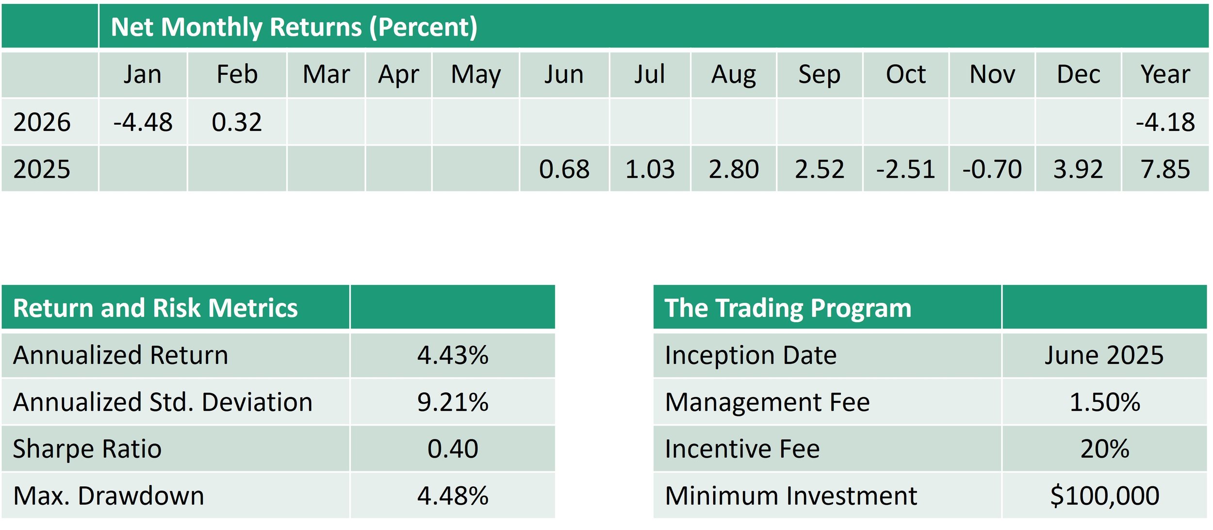 In February, the Volatility Long/Short trading program gained 0.32 percent after fees. It was a challenging period. The portfolio had about as many winning as losing days. The main contributor to gains was short call positions on E-mini S&P 500 futures contracts. This returned approximately 0.25 percent. Positions in VIX futures contracts, meanwhile, were relatively flat.