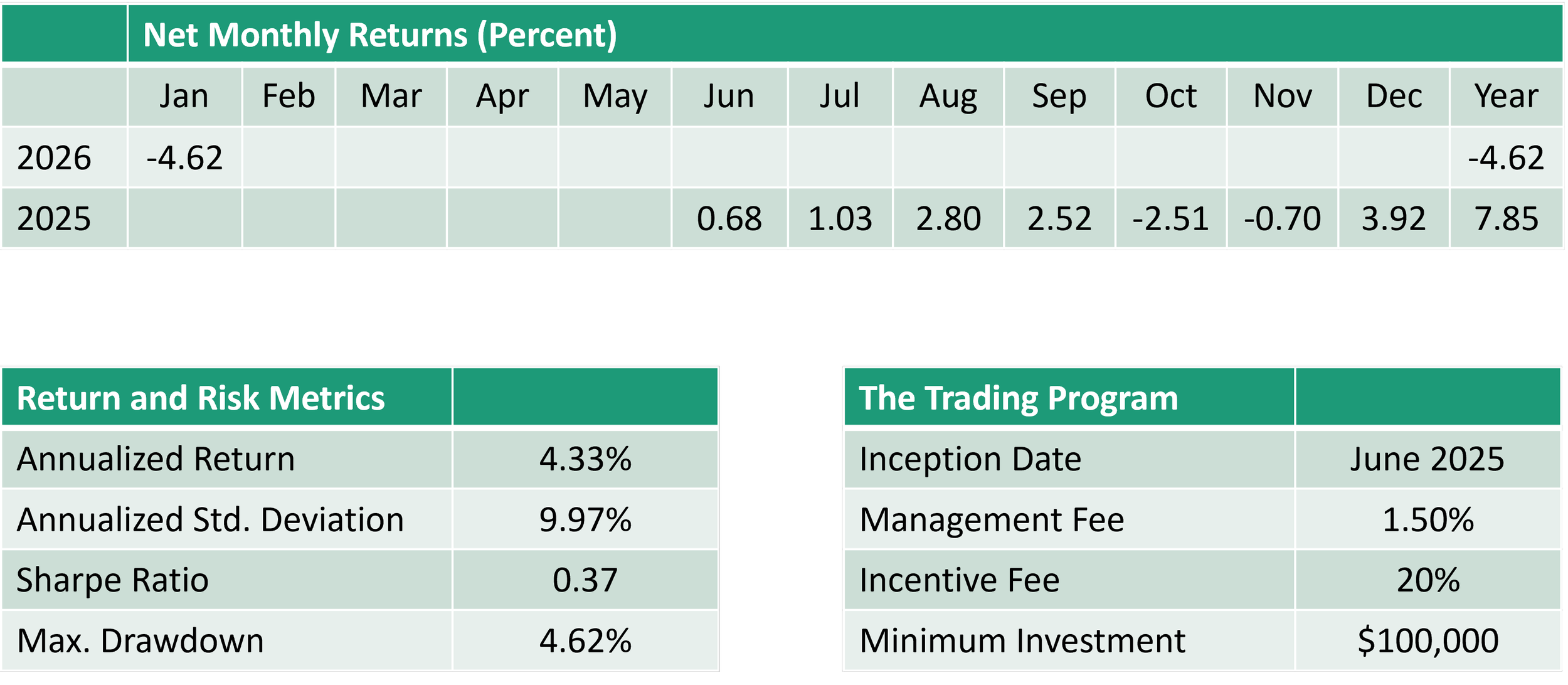 Losses on short VIX futures positions were partially offset by holdings of longer-dated VIX contracts and a short exposure to the S&P 500 futures contract. Nevertheless, the trading program declined 4.62 percent during the first month of the year.
